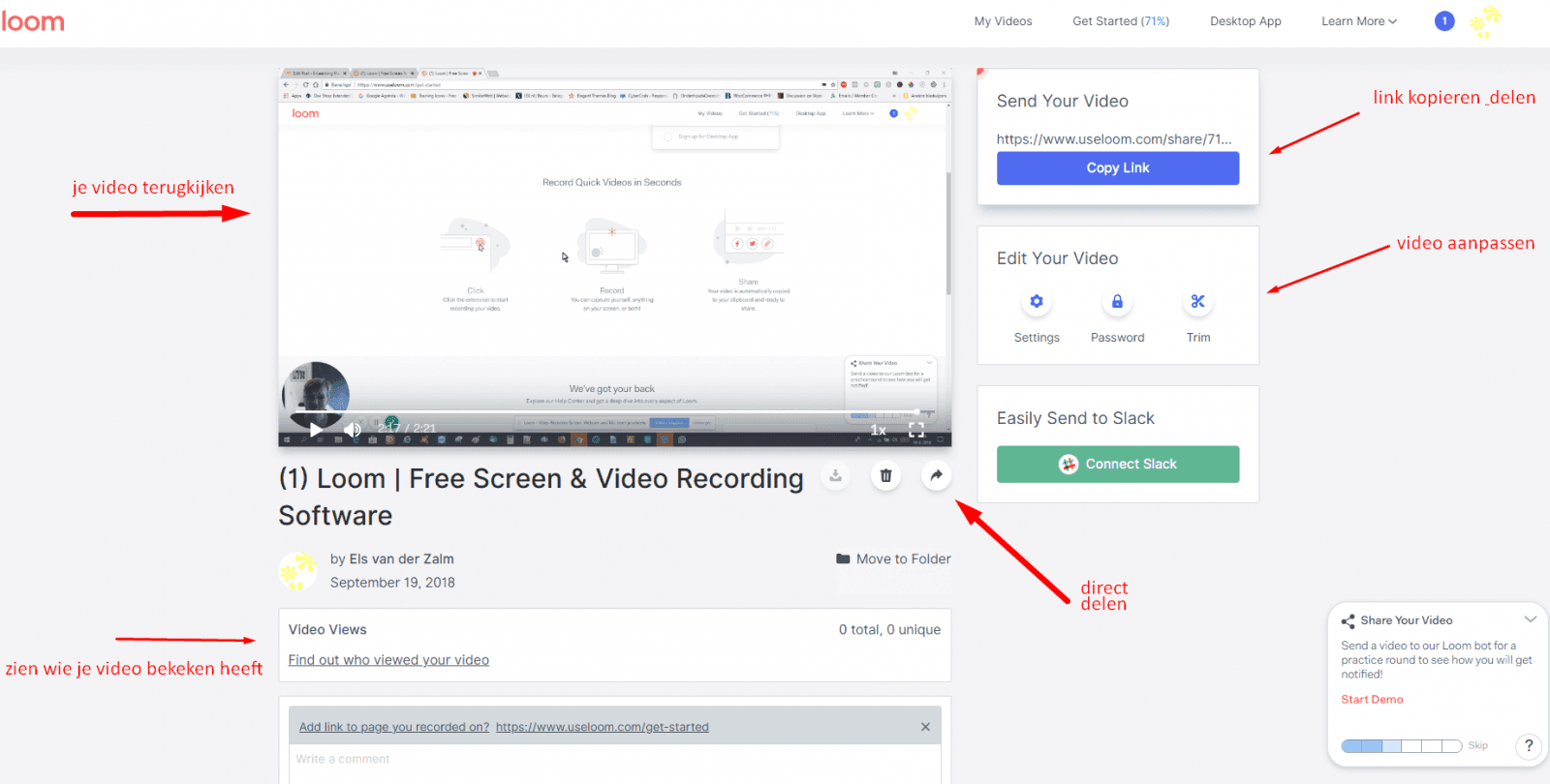 Sinds dit artikel verscheen, zijn er een aantal zaken veranderd in Loom. Loom is nog steeds gratis te gebruiken, maar er zijn nu limieten voor niet-betalende Loom gebruikers. De belangrijkste is dat je video-opname niet langer dan 5 minuten mag zijn. Als je dus geen betaalde account hebt maar wel een langere opname wil maken, dan is de oplossing om dat in delen van 5 minuten te doen. Dat heeft ook voordelen! Uitleg in kleine hapklare brokjes is makkelijker te volgen. Bovendien dwingt het jou als maker om je te beperken tot het noodzakelijke en niet onnodig uit te weiden.