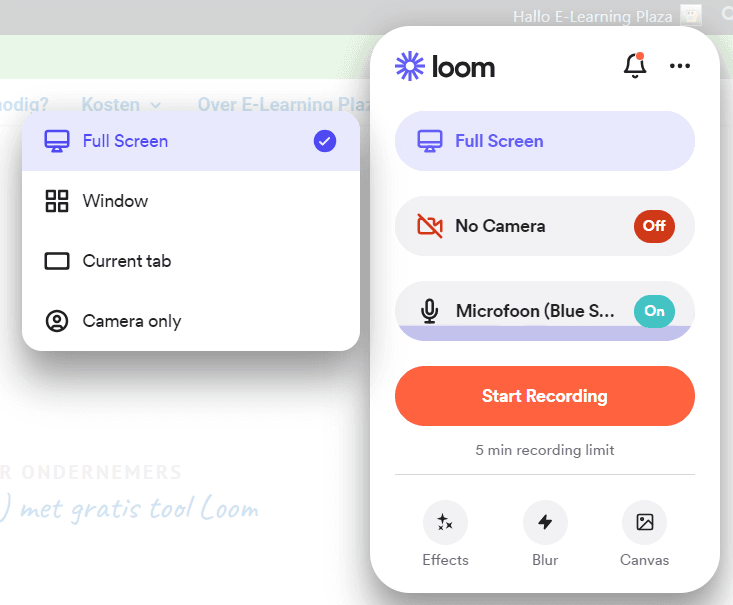 In de afbeelding zie je het menu dat verschijnt nadat je het icoontje in je browser hebt aangeklikt. Klik op de bovenste knop, kies liks uit het menu wat je wilt opnemen en waarmee, zet je camera aan of uit en klik op de rode knop om je opname te starten!